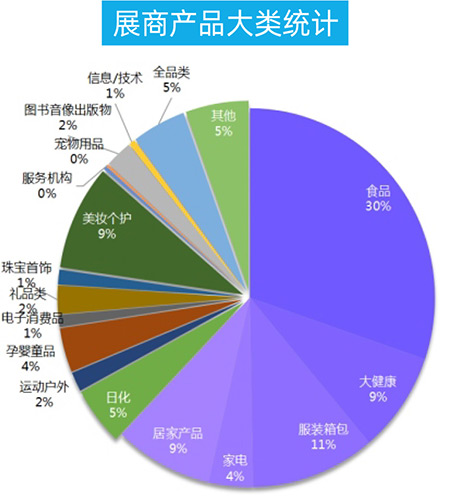 本次參展展商產(chǎn)品品類中排名前六位的品類依次是:食品,服裝箱包,美妝,大健康,居家產(chǎn)品,全品類。